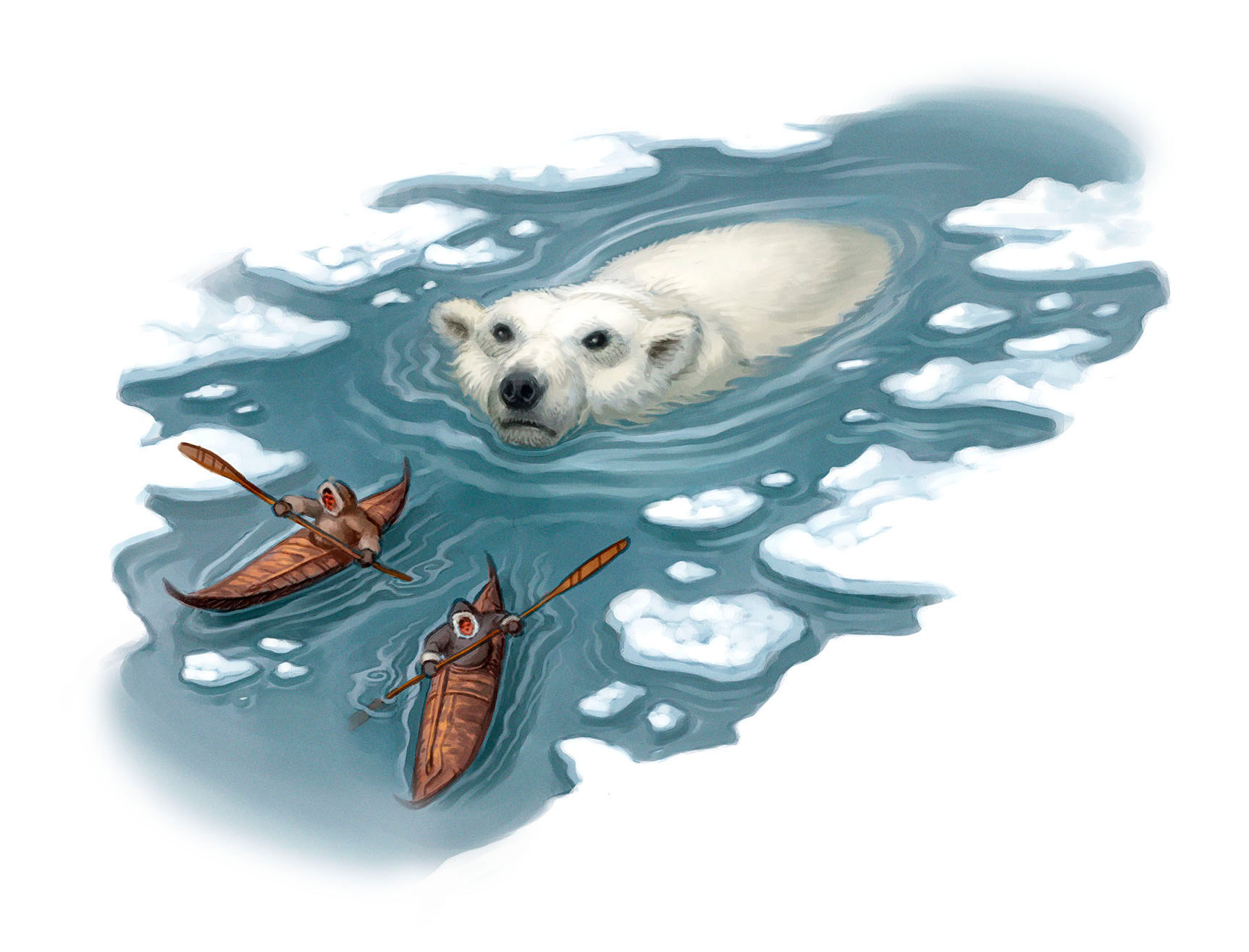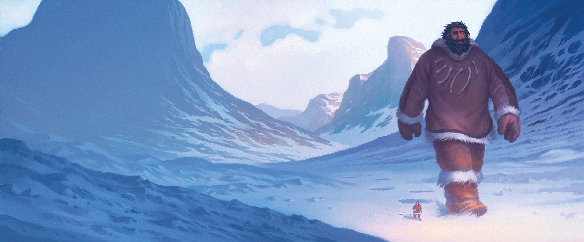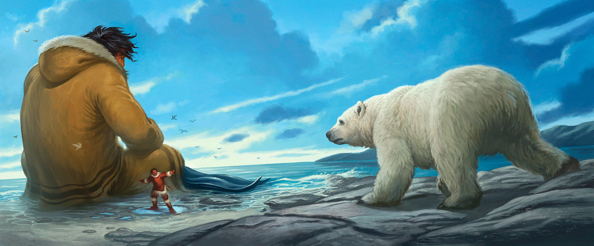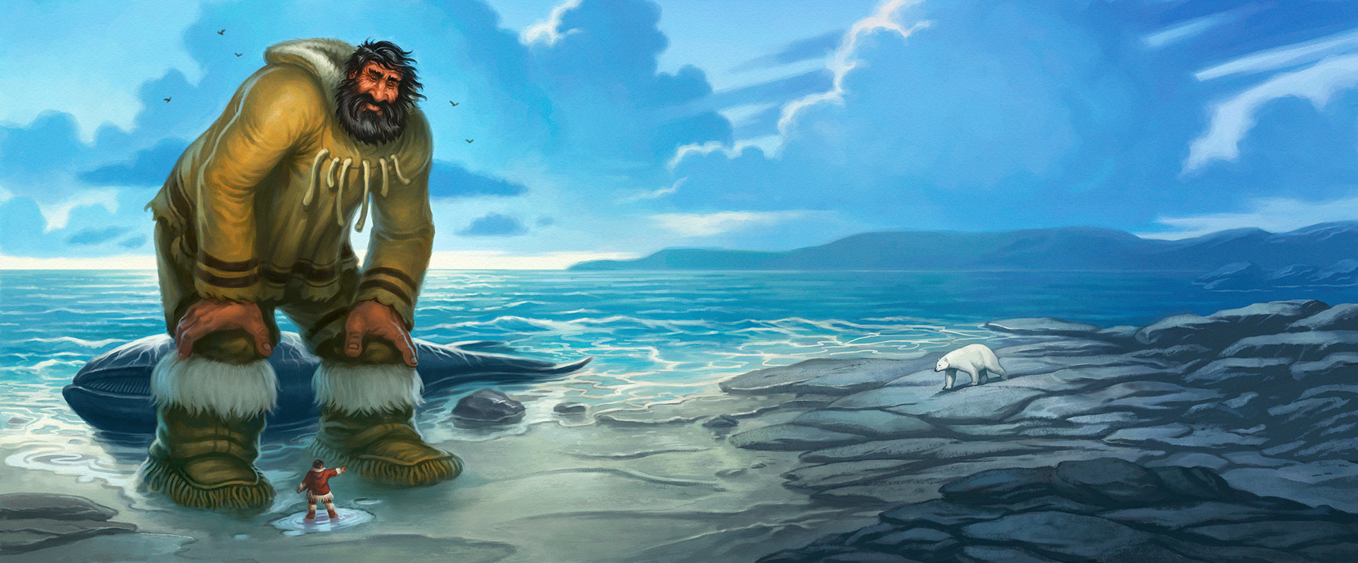 This is a series of illustrations for a picture book titled On the Shoulder of a Giant, written by Neil Christopher and based on a pan-Arctic Inuit traditional story. It tells the tale of a giant named Inukpak who adopts a human hunter. I've included the front and back cover illustrations along with a selection of interior spreads and a couple of vignettes that appeared in the back of the book.