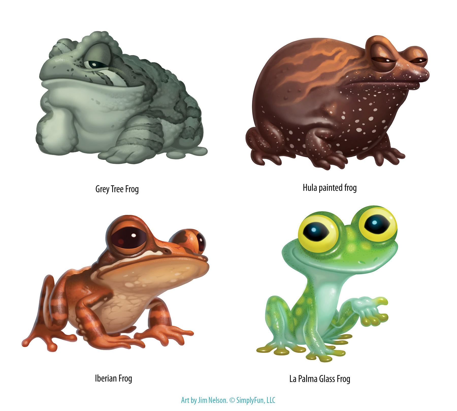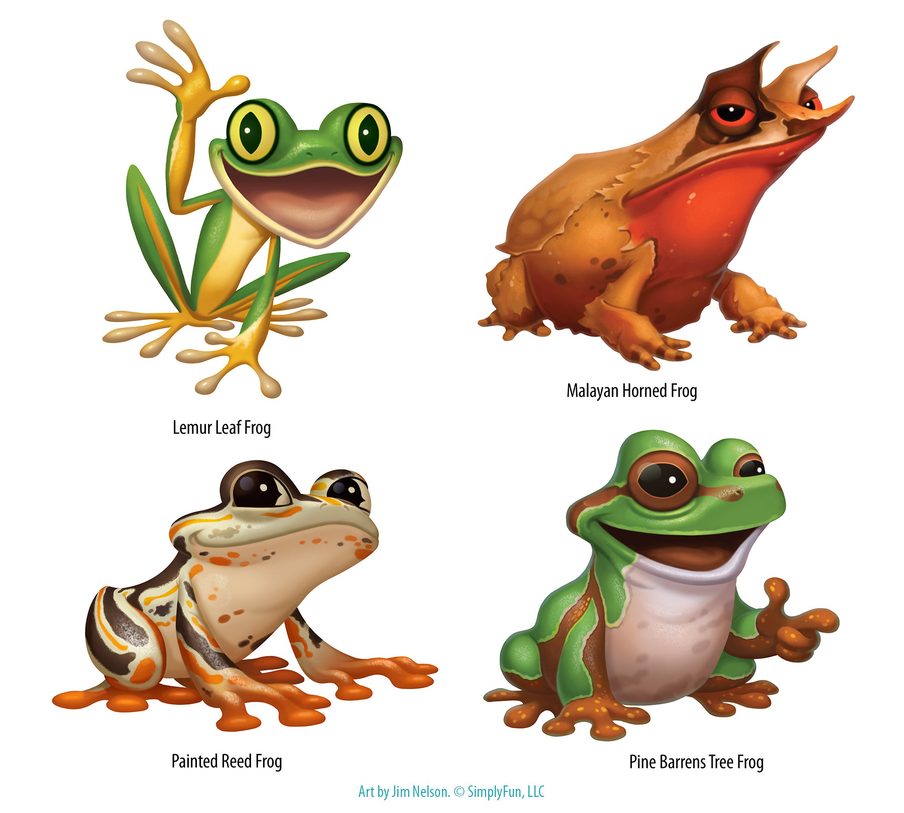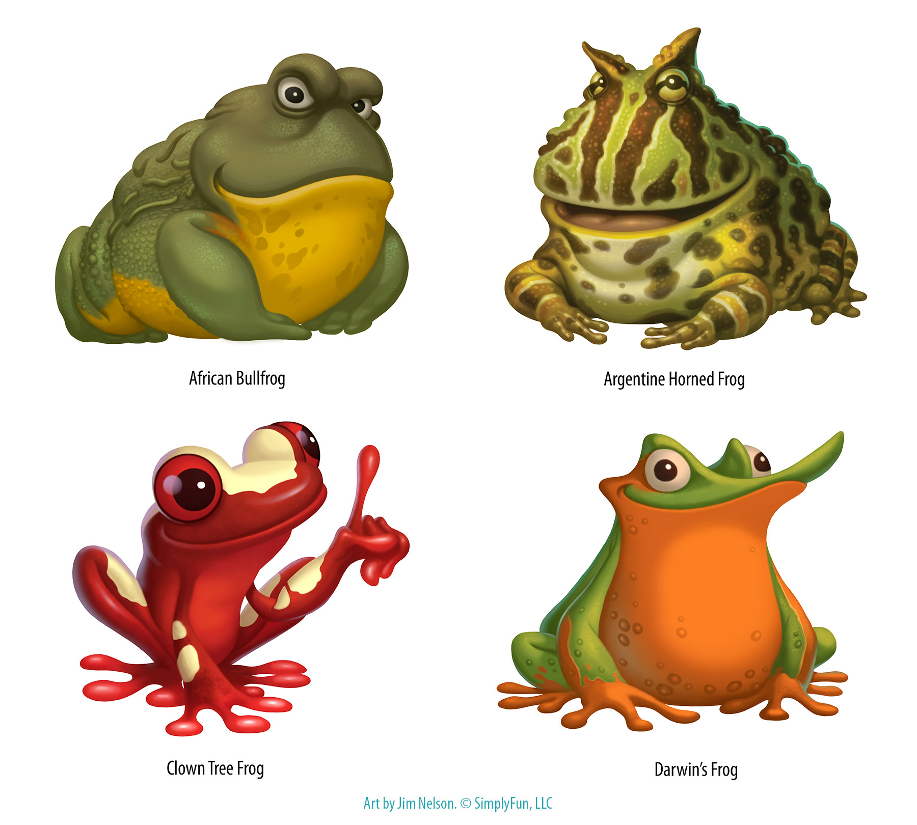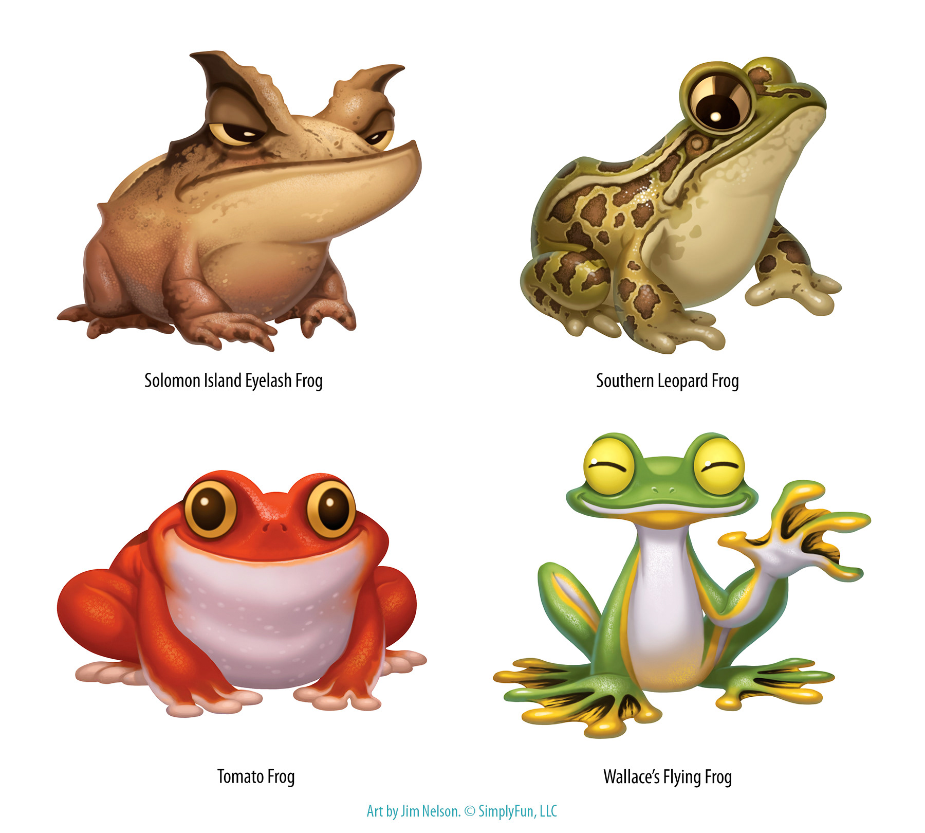 It was a pleasure to work on this project. Each frog character is based on a real species and my goal was to give each character a fun, unique design with the markings and coloration distinctive to the actual species.