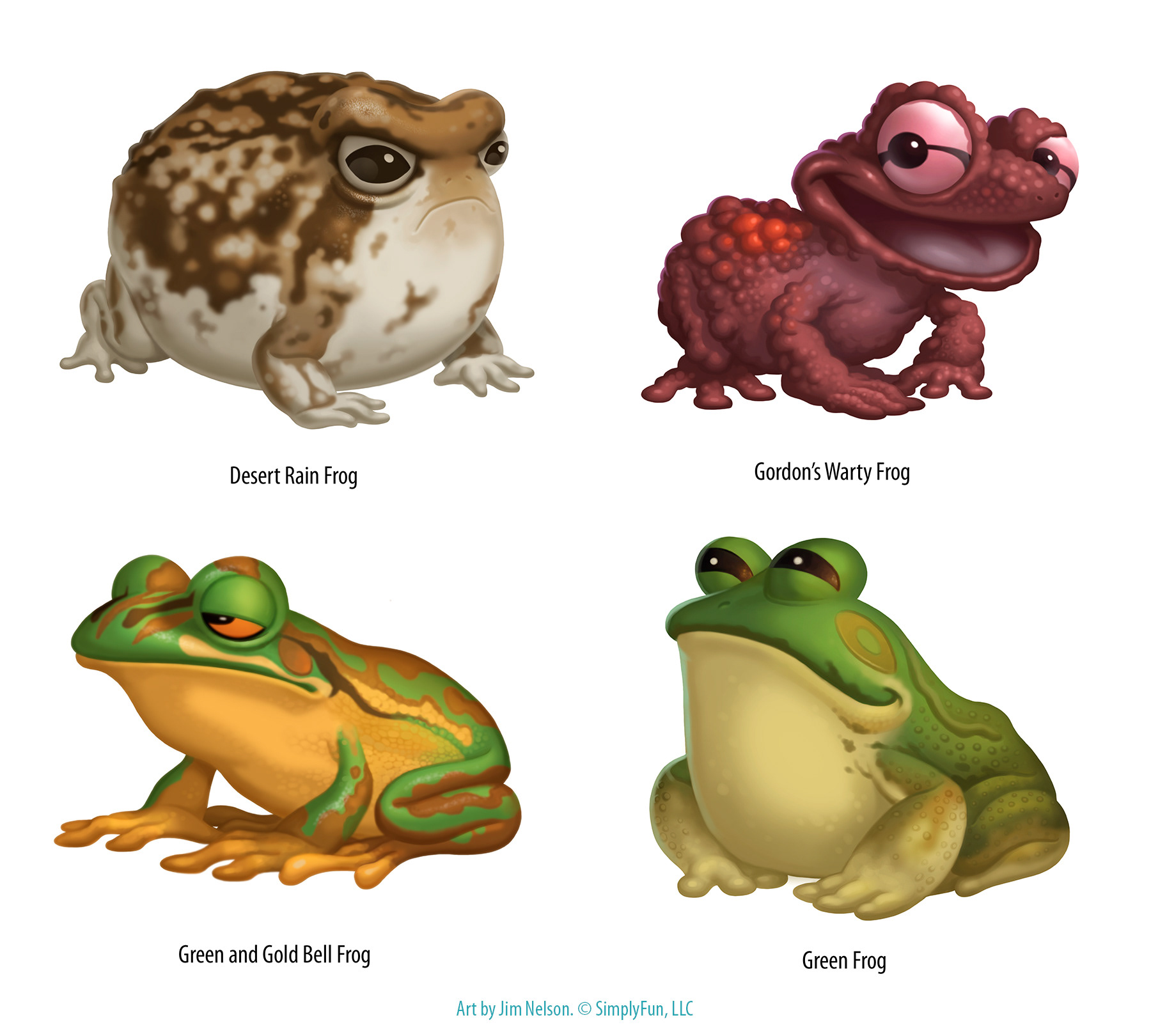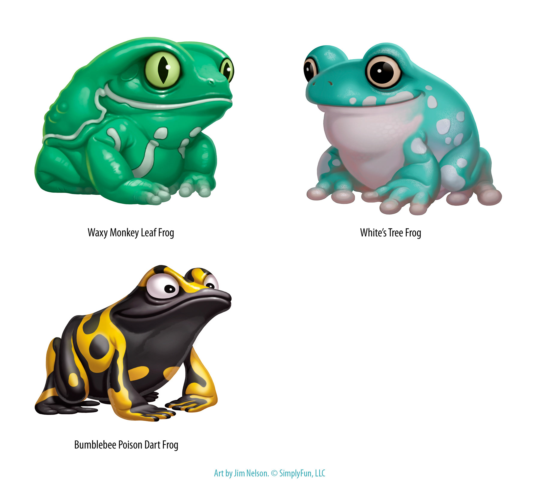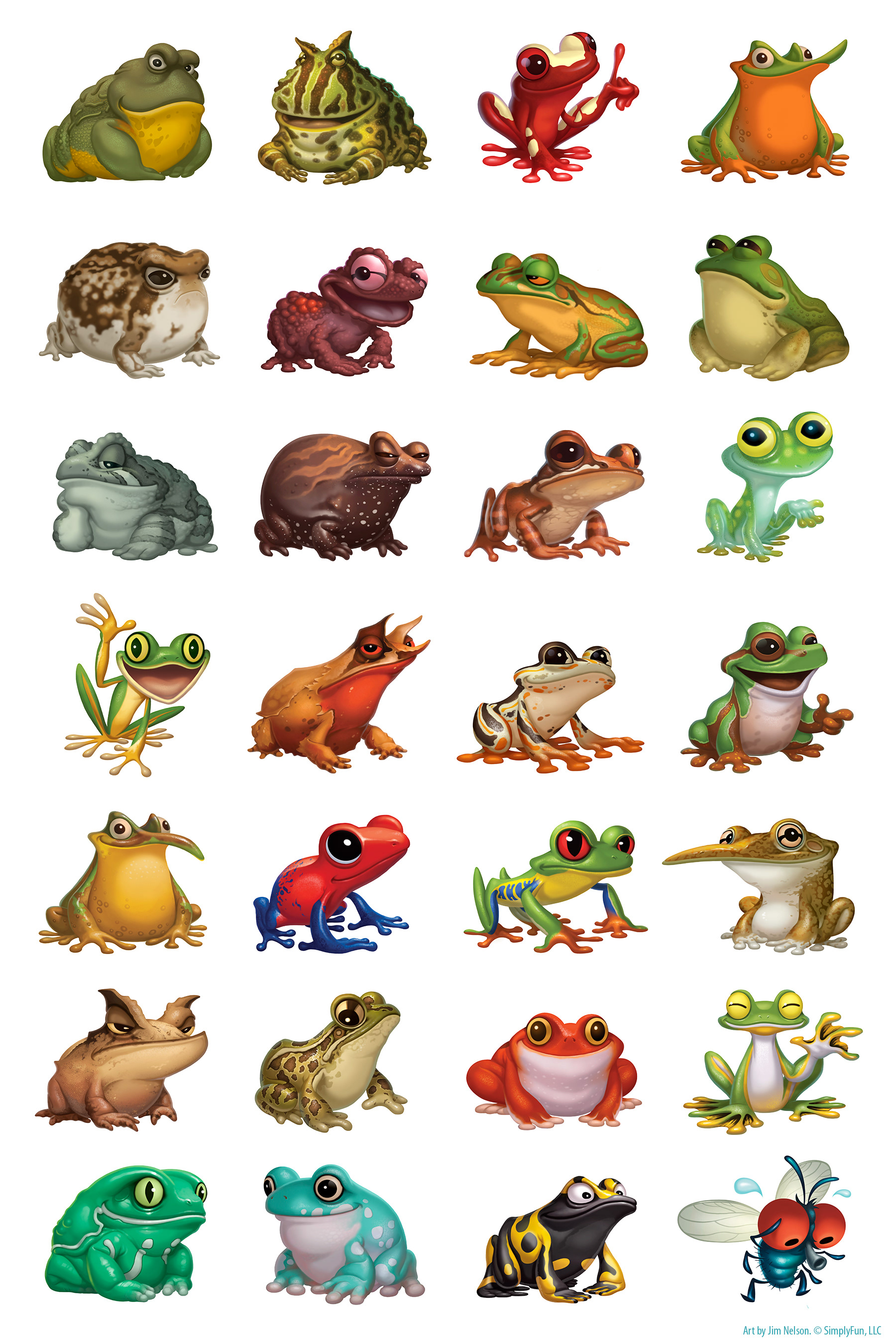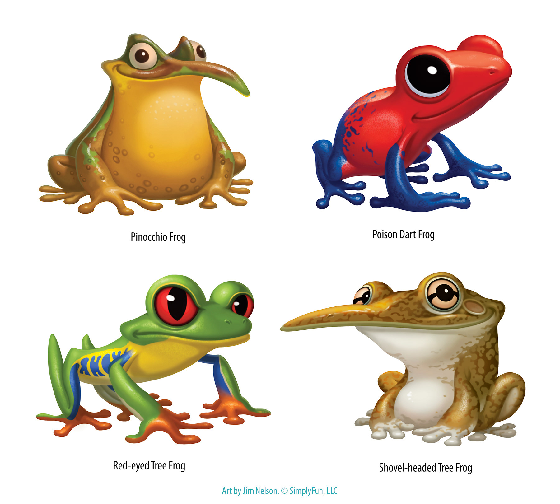 It was a pleasure to work on this project. Each frog character is based on a real species and my goal was to give each character a fun, unique design with the markings and coloration distinctive to the actual species.